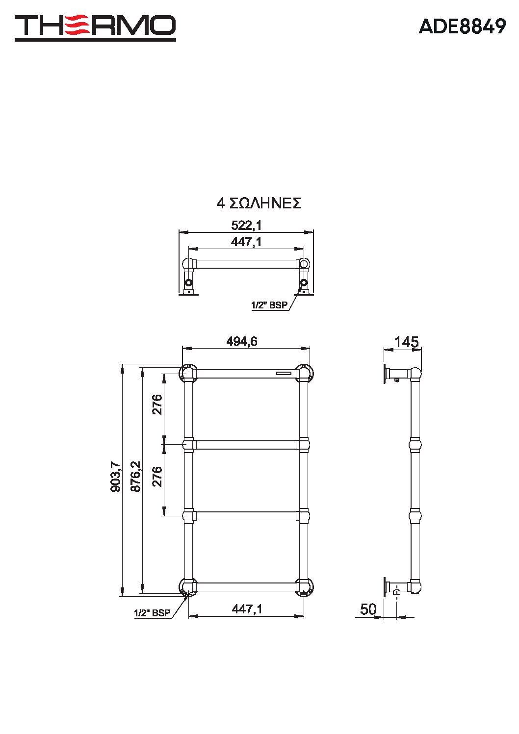 Θερμαινόμενη πετσετοκρεμάστρα ADELPHI 88×49 από ανοξείδωτο χάλυβα AISI 304 με υδραυλική ή ηλεκτρική λειτουργία, THERMO